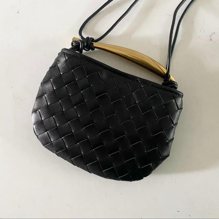 - 가죽 소재를 인트레치아토 위빙으로 완성한 미니 크로스바디 메탈 탑 핸들백